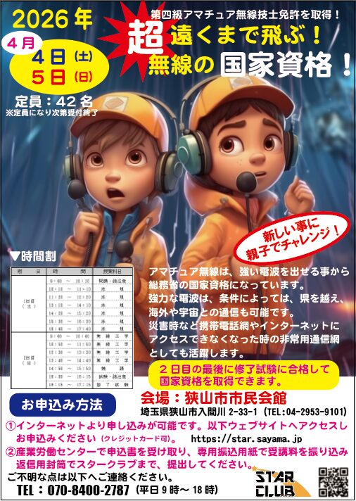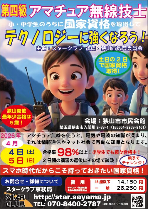 災害時の備えや、新しい趣味として「アマチュア無線」に挑戦してみませんか? 埼玉県狭山市にて、2026年4月4日(土)・5日(日)の2日間でアマチュア無線の国家資格が取得できる特別講習会が開催されます。