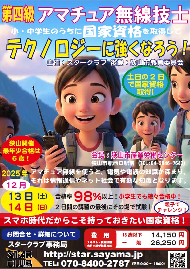 【狭山市】2日間で国家資格「第四級アマチュア無線」を取得しよう!2025年12月13・14日開催。合格率98%以上、小学生や親子での参加も大歓迎。災害時の通信手段やテクノロジー教育に最適です。定員42名、詳細・申込はこちら。【スタークラブ】